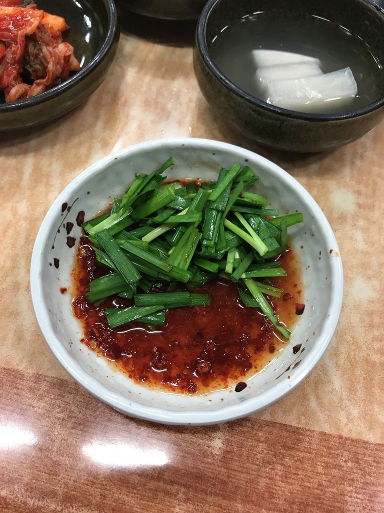 這裡的吃法是雞肉搭配醬料跟韭菜一起吃